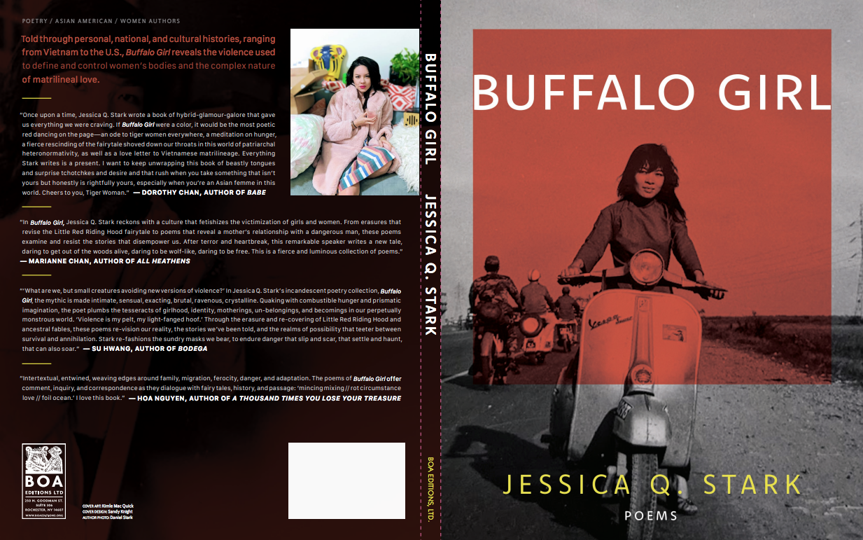 Told through personal, national, and cultural histories, Buffalo Girl is a feminist indictment of the violence used to define and control women’s bodies. Interspersed throughout this hybrid work are a series of collaged photographs, featuring Stark’s mother’s black-and-white photography from Vietnam beautifully and hauntingly layered over various natural landscapes — lush tropical plants, dense forests, pockets of wildflowers. Juxtaposing the moral implications of Little Red Riding Hood with her mother’s photography, Stark creates an image-text conversation that attends to the wolves lurking in the forests of our everyday lives. Here is an inversion of diasporic victimhood. Here is an unwavering attention to the burdens suffered by the women of this world. Here is a reimagination, a reclamation, a way out of the woods.